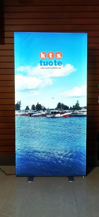 Helposti liikuteltava kaksipuolinen valomainos messuille.